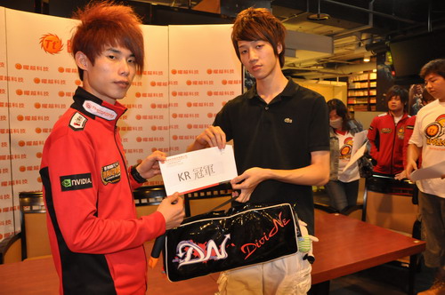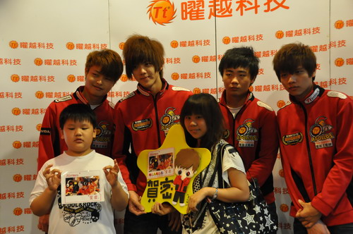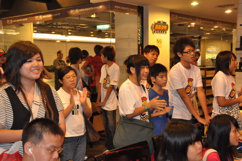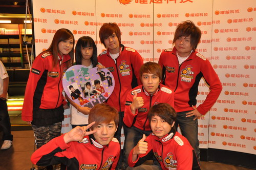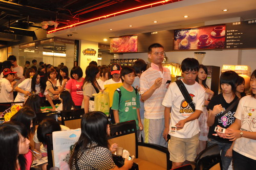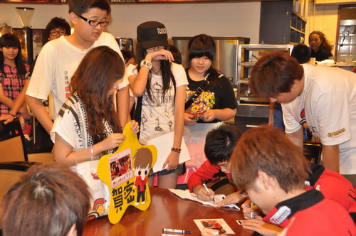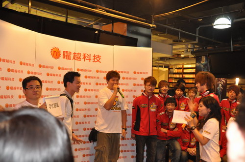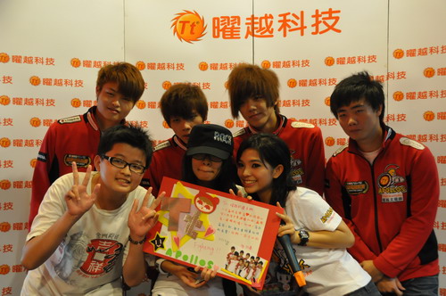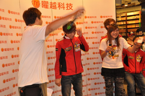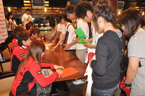 當天測試賽是在哈哈活力站民生店內玻璃屋內舉行,而玻璃屋外,就是粉絲簽名會囉!因為一開始是SF Online先進場比賽,所以跑跑小將們就先在玻璃屋外和粉絲們簽名合照!