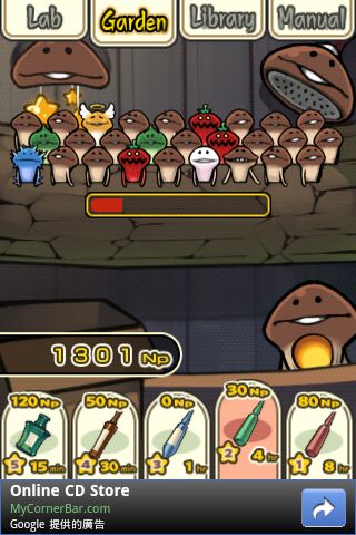 Mushroom Garden雖然是英文遊戲,但界面非常簡單,只要好好種植蘑菇,累積金幣就可以換取設備升級,偷偷告訴大家,每一個設備的功能都不相同唷,例如換取一次水龍頭,就可以加速蘑菇生長的速度!