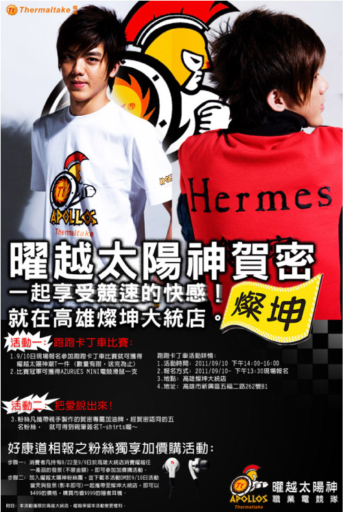 期許打造曜越成為娛樂、電競、科技、生活的文化品牌,近年來致力於品牌的持續經營,並努力投入電子競技的領域,為了迎接暑假最後一個盛事,同時感謝所有玩家的支持,決定將這股太陽魅力延燒到南台灣去囉!9/10日將在高雄燦坤大統店舉辦跑跑卡丁車的現場挑戰賽,不只邀請到太陽神中的跑跑小天王「賀密」親臨現場與粉絲相見歡之外,更有許多專屬好禮要送給挑戰者!除此之外,凡消費者持8/22至9/9日於高雄大統燦坤店消費曜越產品的發票(不限金額);,並加入「曜越太陽神」粉絲團列印本活動DM,就可於9/10活動當天以$249元購買市價$999的Tt eSPORTS 專業電競耳機-隱者喔!